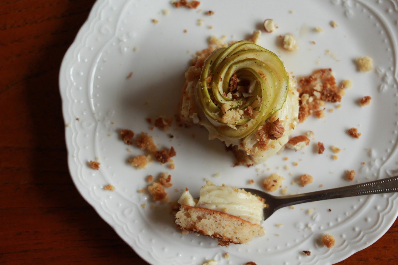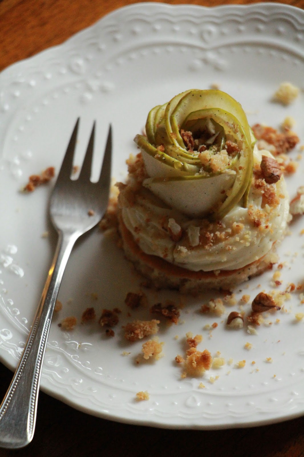- קרצו עיגולים מהביסקוויט. טבלו בסירופ הסוכר בעדינות. העבירו את הקרם לשק זילוף עם צנתר משונן. זלפו את הקרם מעל הביסקוויט. הניחו פרח תפוח מעל הקרם ופזרו פקאן קצוץ ופירורי בצק פריך.