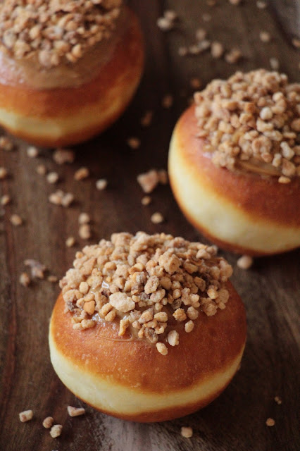 הפעם הכנתי (ביום ההולדת שלי, האמת!) את הסופגניות האלה, מבצק עשיר ונהדר לפי מתכון של "דלאל", ממולאות בנדיבות בקרם פטיסייר פרלינה עשיר עם קצפת, מצופות בזיגוג של שוקולד לבן מקורמל ומחית נוגט ומקושטות בהמון המון ברס. אלה סופגניות מעולות לחובבי ולחובבות אגוזי הלוז. הברס מוסיפים קראנץ' ומתיקות, המילוי עשיר ונהדר וזיגוג השוקולד הלבן המקורמל מדגיש את הטעם הקרמלי. והן פשוט נהדרות! אז הנה המתכון, לכבוד הנר הראשון. חג שמח :)