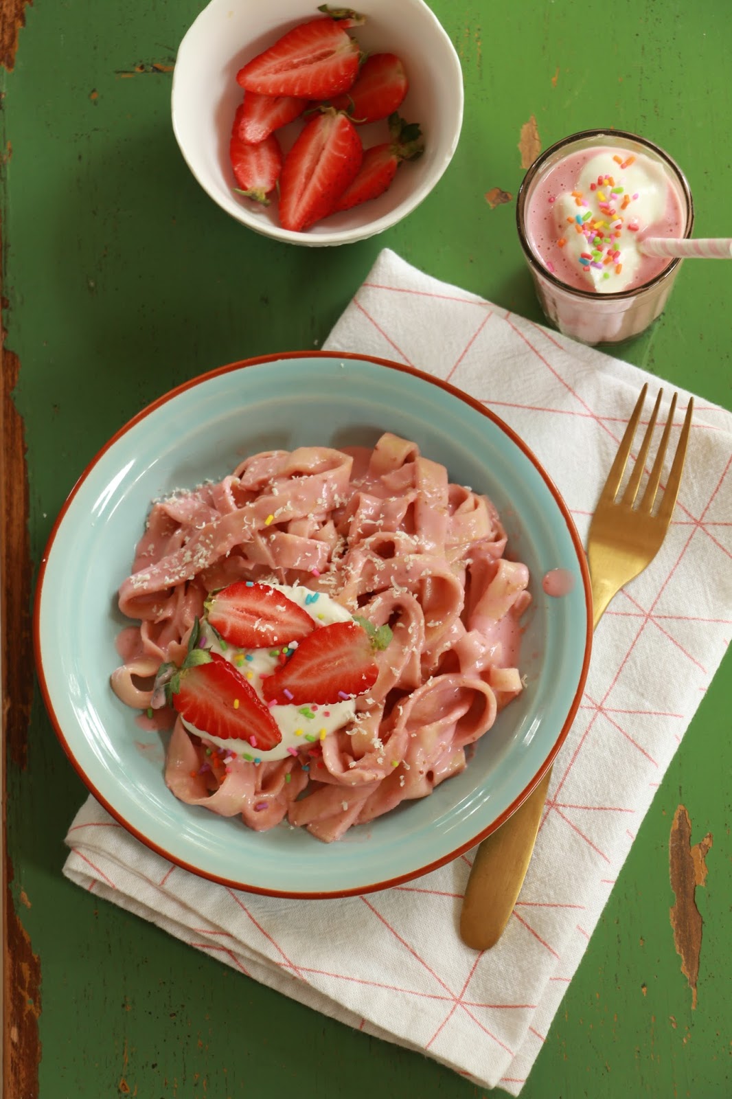 אוקיי, אני יודע שזה נראה קצת מוזר (כי זה נראה בול כמו פסטה וזה ורוד ועם ספרינקלז וקצפת, כן) אבללל אלה בכלל קרפים! אז זרמו שניה: קרפים שחתכתי כמו פטוצ'יני עם שוקו תות ושוקולד לבן, קצפת, תותים וספרינקלז. וזה לא רק נשמע מדהים, זה באמת מעולה. ובתכלס, אחת המנות הכי מהממות, הכי ורודות והכי מנצנצות אבר!! (למרות שזה נראה כמו פסטה עם קצפת). אז תכינו את זה, ארוחת בוקר מהממת לאחד באפריל! (ולשאר השנה) עם טעם מעולה של שוקולד לבן ותות ומלאן ורוד ♥